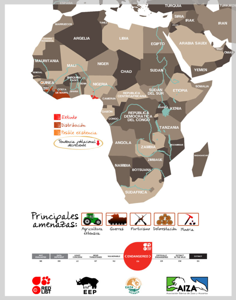Se encuentra en grave peligro de extinción debido al creciente desarrollo de la agricultura, que va destruyendo la selva donde habita; y a su caza por parte de las poblaciones indígenas, ya que su carne es muy apreciada.